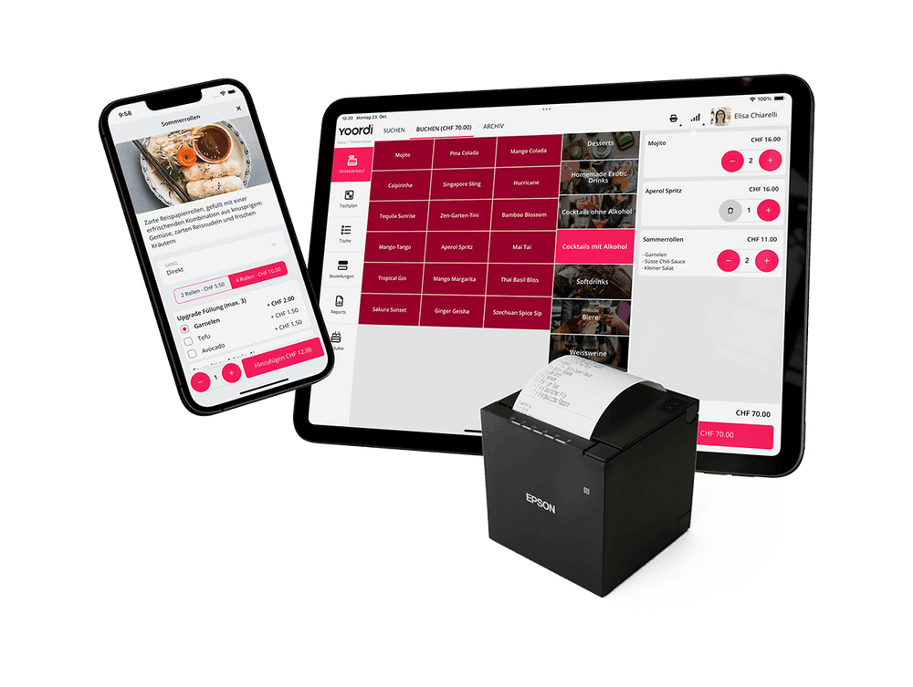 With Yoordi POS and PAX A77 terminals, you bring the cash register and card reader directly to the table. Enter orders and conveniently collect payments through our payment partner Wallee - all on one device and fully automatic, without having to manually enter amounts. This saves you steps and time with every payment transaction.